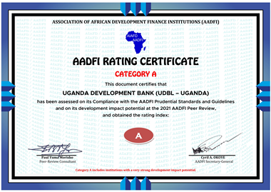 UDB achieved an A+ rating from the Association of African Development Finance Institutions (AADFI), affirming its leading status as a best-performing Development Finance Institution (DFI) in Africa